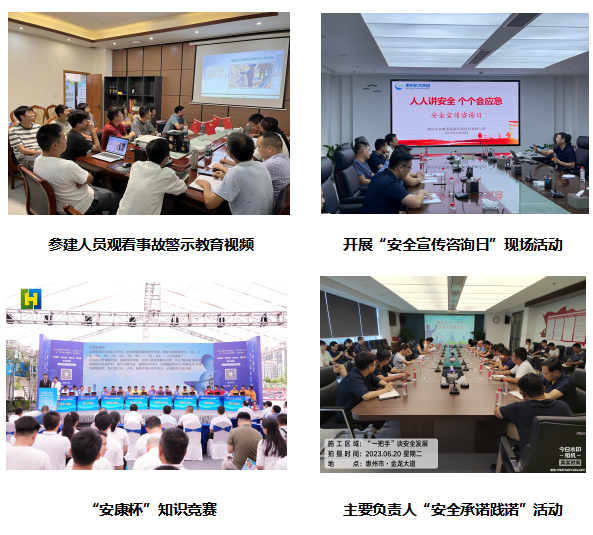 集團(tuán)積極參與安全生產(chǎn)網(wǎng)絡(luò)知識(shí)競(jìng)賽,組織參與人數(shù)173人,答題446次,發(fā)布視頻3個(gè)。參與拍攝制作科普宣傳片《惠州市工程建設(shè)領(lǐng)域有限空間作業(yè)及應(yīng)急演練示范視頻》,積極普及安全生產(chǎn)常識(shí)。承辦惠州市建筑施工“安康杯”知識(shí)競(jìng)賽,吸引23萬(wàn)余人觀看,集團(tuán)所屬市水電建筑公司榮獲本次“安康杯”知識(shí)競(jìng)賽最佳組織獎(jiǎng)。開展企業(yè)主要負(fù)責(zé)人“安全承諾踐諾”活動(dòng)10場(chǎng),參與171人次,推動(dòng)企業(yè)主要負(fù)責(zé)人嚴(yán)格履行安全生產(chǎn)職責(zé),帶頭尊法、學(xué)法、守法。