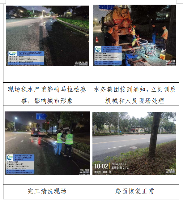 接到通知后,集團領導高度重視,立即組織相關負責人趕往現(xiàn)場,會同市市政園林事務中心共同開展處置工作,現(xiàn)場初步勘查發(fā)現(xiàn)沿線三個污水井無法開啟,滿管污水正不斷往路面溢流??紤]到“惠馬”賽事開跑在即,為保障“惠馬”比賽順利進行,在時間異常緊迫的情況下,集團要求市排水管理中心立即調(diào)度人員和市政排水工具車、高壓沖水車、吸污車等機械車輛,對涌水路段進行緊急高壓水槍沖打、封堵氣囊、抽排吸污,并在吸污完成后清洗了路面。次日,集團派員實時關注路面情況,經(jīng)緊急處理后的路面情況正常,路面整潔干燥,無污水溢流等情況,馬拉松比賽未受影響。