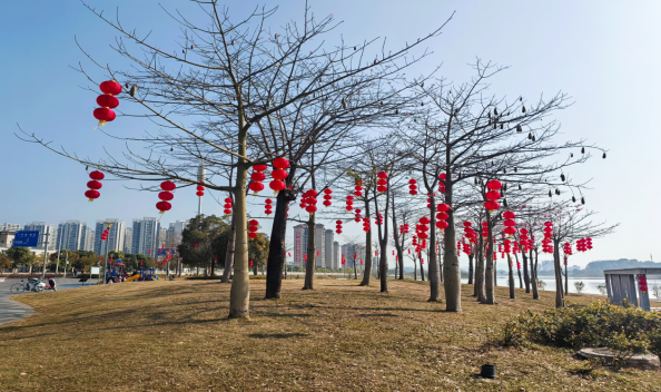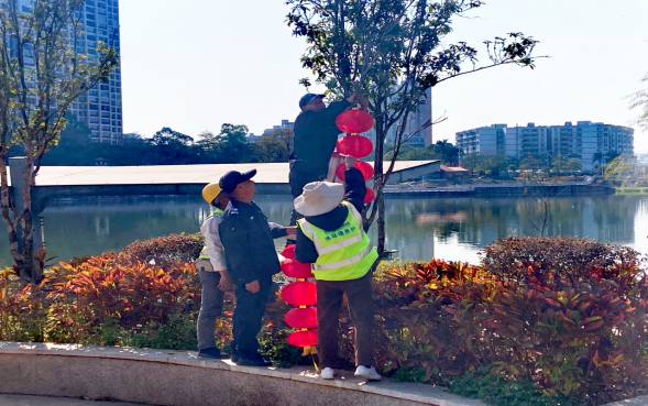 本次活動主要對“兩江一河”、望江瀝、大湖溪瀝、新開河、青年河、金山河、激流坑等管護項目進行美化裝扮,現(xiàn)場管護人員利用彩燈、燈籠、中國結等裝飾元素,對河道景觀公園設置了多處新春主題景觀小品。當夜幕降臨時,彩燈璀璨,燈籠高掛,增添了濃厚的節(jié)日氣氛。