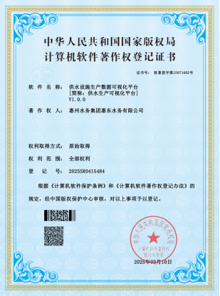 惠州水務(wù)集團(tuán)所屬惠東水務(wù)公司自主開發(fā)系統(tǒng)獲得軟件著作權(quán)證書