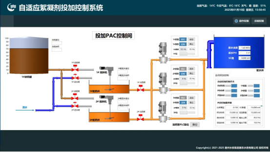 系統(tǒng)主要功能 該系統(tǒng)具備絮凝劑智能投加功能,通過多參數(shù)水質(zhì)數(shù)據(jù)(流量/溫度/濁度/pH等)自動調(diào)節(jié)PID實現(xiàn)精準(zhǔn)控制,同步兼容手動干預(yù)模式。實時監(jiān)測藥罐液位與攪拌狀態(tài),確保藥劑配備充分、混合均勻,保障絮凝工藝穩(wěn)定高效運行。