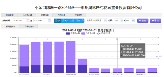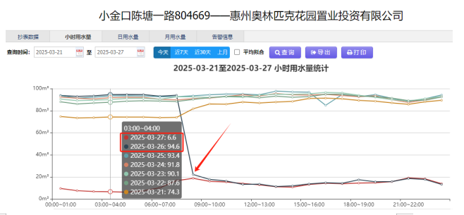 2025年3月,奧林匹克花園小區(qū)進水管道在智慧水務平臺監(jiān)測中持續(xù)觸發(fā)異常預警。公司調(diào)度服務中心控漏組以DMA分區(qū)監(jiān)控數(shù)據(jù)為基準,發(fā)現(xiàn)該封閉區(qū)域內(nèi)實際漏水量與理論用水量差值超常,數(shù)據(jù)顯示該管道每日0點至6點最小流量達94.6m3/h,較去年同期暴增15倍以上;日間水量亦較日常均值持續(xù)攀升。同時,客服短期內(nèi)連續(xù)接到該小區(qū)居民水壓不足的投訴,經(jīng)多維度數(shù)據(jù)交叉驗證,研判其存在較大隱蔽性暗漏風險?。