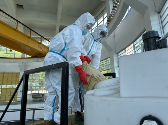 此次演練圍繞原水油跡污染及pH異常偏低兩個(gè)場景展開。演練中,發(fā)現(xiàn)“取水口出現(xiàn)少量油跡污染”后,吸水泵房巡檢人員立即上報(bào)并警戒現(xiàn)場,應(yīng)急小組迅速攜帶攔油網(wǎng)、吸油毯趕赴現(xiàn)場,30分鐘內(nèi)完成油污攔截與吸附,快速控制污染。隨后模擬原水pH值為6.3時(shí),吸水泵房應(yīng)急加藥系統(tǒng)迅速啟動(dòng),現(xiàn)場處置組協(xié)同配置藥劑、調(diào)試設(shè)備,精準(zhǔn)投加調(diào)節(jié),不到1小時(shí)即讓水質(zhì)穩(wěn)定在安全范圍。演練過程中,吸水泵房作為一線處置陣地,及時(shí)啟動(dòng)應(yīng)急預(yù)案,確保取水水質(zhì)符合生產(chǎn)要求。同時(shí),將觀洞水庫作為備用水源隨時(shí)待命,形成“即戰(zhàn)即防”的堅(jiān)實(shí)防線。